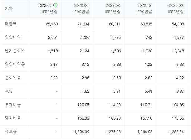 - 2023년2분기 연결기준 매출액 7조 1634억 원으로 전년동기대비 28% 상승.