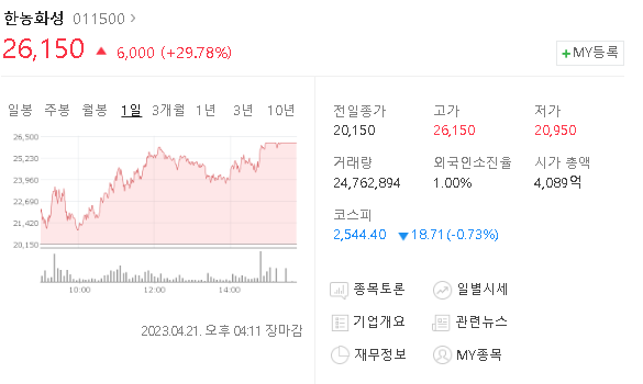 모든 2차 전지관련주가 하락을 하고 힘이 빠지고 있을 때 어느 정도 돌고 있던 이슈 거리를 한농화성이라는 종목에 대놓고 뉴를 붙이면서 주가흐름에 영향을 주는 모습이었습니다.