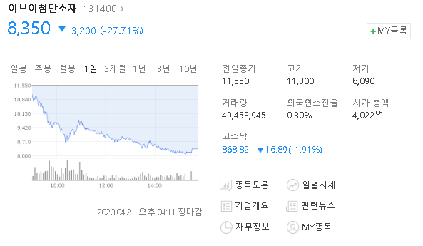 다 같이 무너진 만큼 그중에서도 눈에 띈 종목은 이브이첨단소재입니다.