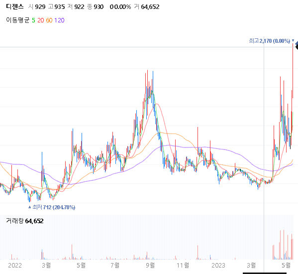 디젠스의 차트적인 측면으로 봤을 때 이전의 테마가 정치 테마였다는 점, 시가총액이 낮다는 점, 상승 이전의 호가창이 가벼웠다는 점을 통해서 세력이 존재한다면, 주가를 움직이는 게 수월 했을 거라고 생각합니다.