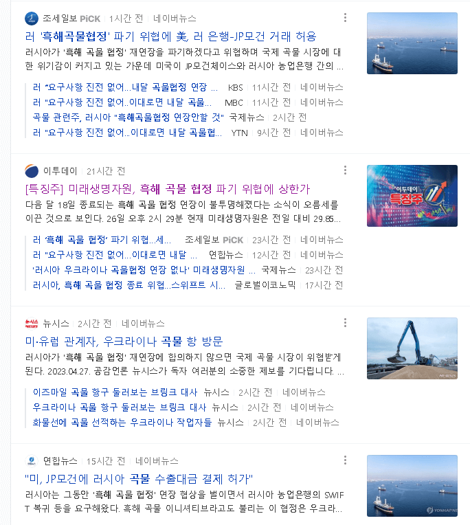 "흑해 곡물 협정"이 말료 되는 날은 5월 18일로 이전까진 뉴스에 대해서 빠른 반응을 보여주는 종목들을 뽑아 봤습니다.