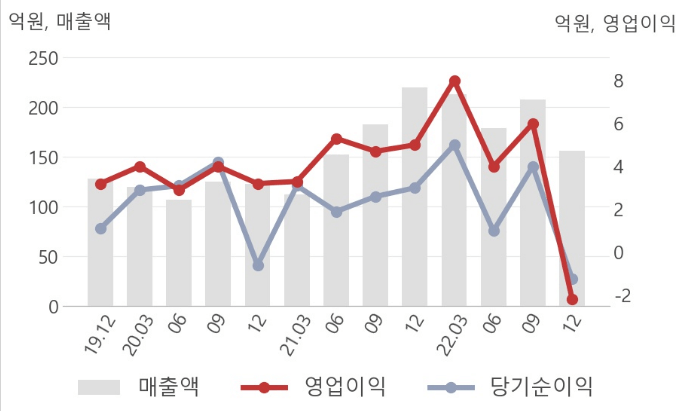 -2022년 4분기 실적 기준 매출액 156억 원 전년 동기 대비 -29% 감소