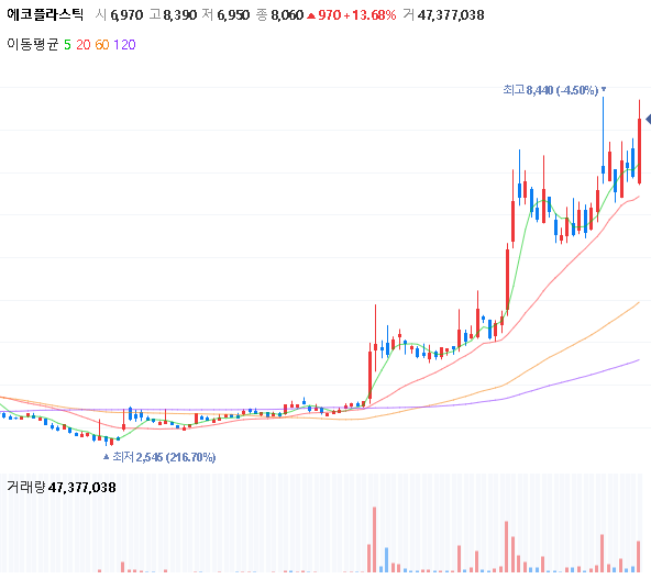 반대로 같은 업종의 코오롱플라스틱은 반응이 없기 때문에 에코플라스틱의 더 숨겨진 호재나 이슈 거리가 있기에 세력의 매집이 이루어지고 시원한 상승을 보이기 때문에 한동안은 무조건 지켜봐야 할 종목이라고 봅니다.
