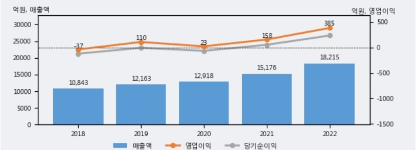 최근이슈로 유리대체, 철대체의 플라스틱을 개발하는데 힘을 쓰고 있으며, 실적 또한 2023년 1분기 기준으로 영업이익과 순이익이 4~5배 올랐기 때문에 최근 시장에서 더욱 좋은 움직임을 보여주고 있습니다.