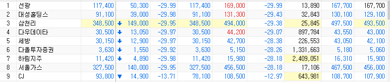 위와 같이 9 종목이 하한가를 가거나 장중 하한가를 터치했습니다. CJ를 제외한 나머지 종목은 하한가위치에서 많은 물량이 쏟아져 나왔습니다. 시장의 큰 악재나 시황에 따른 물량이 아니라 투자회사의 물량이 나오는 거 같습니다.