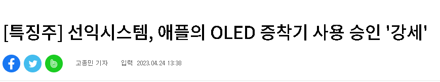 오늘 장중 뉴스 사진과 같은 제목으로 애플이라는 대형주의 이름과 함께 뉴스가 나왔습니다. 핵심 내용은 애플은 LG디스플레이의 자사향 OLED 패널 생산라인 투자 시 선익시스템의 8세대 OLED(유기발광다이오드) 증착기 사용을 허가했다. 라는 내용인데 여기서 정말 LG디스플레이에서 선익과 함께 한다면?이라는 기대심리가 작용하여 주가 상승에 큰 영향을 주었다고 생각합니다.
