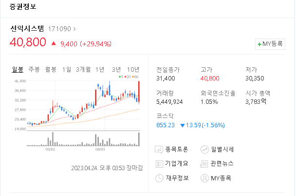 이런 뉴스의 등장과 동시에 수급이 몰리면서 1차 vi발동이후 가파르게 상승하여 2차 vi 발동하여 13시 27분에 상한가까지 터치하였습니다. 이후에 차익실현 매물과 전고점 매물이 출몰하여 깊은 하락을 하는 듯하였지만 13시 33분 상한가 이후 저점을 찍으면서 장가마감 23분 전인 15시 07분에 상한가를 닫으며 장이 종료될 때까지 자리를 든든하게 지켜준 모습을 보여줬습니다. 선익시스템이 상한가를 닫았지만 전고점인 40950원을 넘어 마감하진 못하였습니다. 분봉상 박스권을 그리면서 횡보하는 흐름이 있었는데 전고점 매물을 소화하는 과정이라고 생각이 듭니다. 그럼에도 상한가라는 리미트에 걸려 전고점을 넘어서서 마무리하지 못했지만, 내일 아침 장초반 즉 시가에 이전고점을 넘어서 시작하게 된다면 크게 시나리오는 둘로 나눌 수 있습니다.